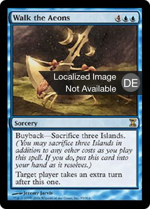 |  Variations— Parts— | Au travers des éonsRappel — Sacrifiez trois îles. (Vous pouvez sacrifier trois îles en supplément de tous autres coûts quand vous jouez ce sort. Si vous faites ainsi, mettez cette carte dans votre main au moment où elle se résout.) Le joueur ciblé joue un tour supplémentaire après celui-ci.