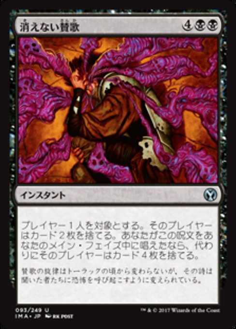 |  Variations— Parts— | 消えない賛歌プレイヤー1人を対象とする。そのプレイヤーはカードを2枚捨てる。 あなたがこのカードをあなたのメイン・フェイズにプレイした場合、代わりにそのプレイヤーはカードを4枚捨てる。