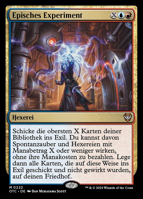 |  Variations— Parts— | Episches ExperimentSchicke die obersten X Karten deiner Bibliothek ins Exil. Du kannst davon Spontanzauber und Hexereien mit umgewandelten Manakosten von jeweils X oder weniger wirken, ohne ihre Manakosten zu bezahlen. Lege dann alle Karten, die auf diese Weise ins Exil geschickt und nicht gewirkt wurden, auf deinen Friedhof.