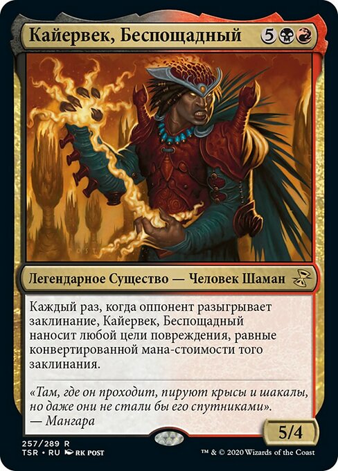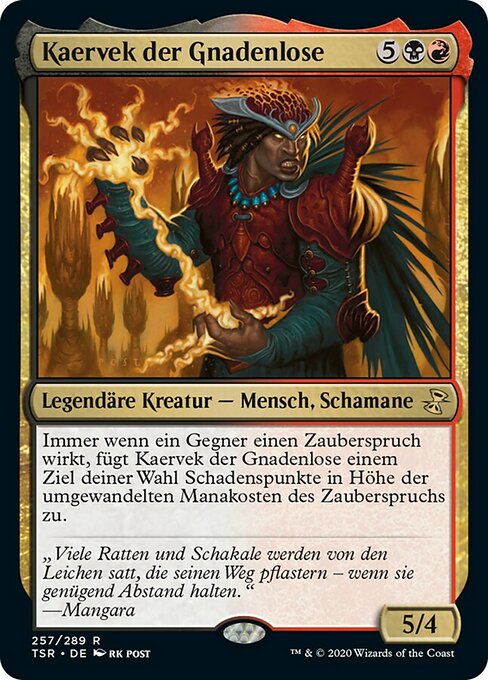 ![]() Variations— Parts— | Kaervek el despiadado5 / 4 Siempre que un oponente lance un hechizo, Kaervek el despiadado hace una cantidad de daño igual al coste de maná convertido de ese hechizo a cualquier objetivo.