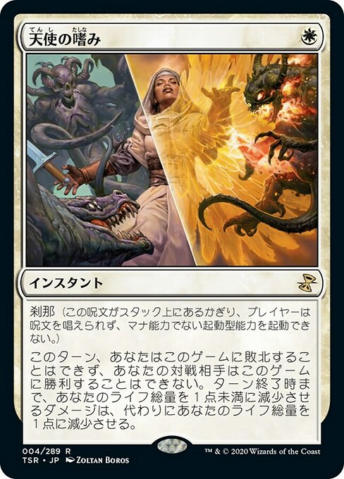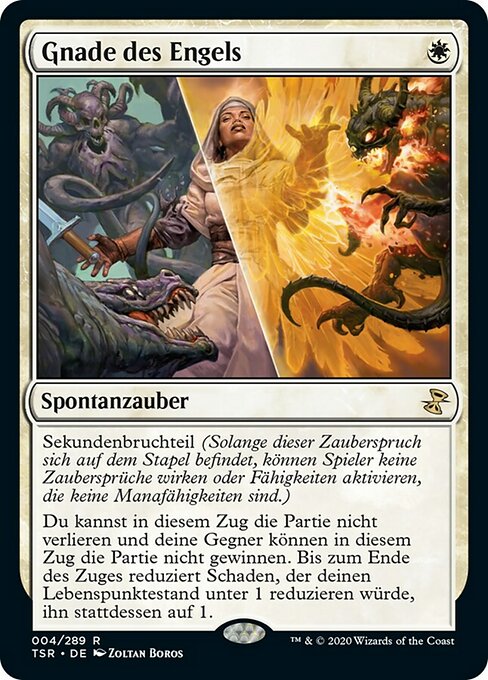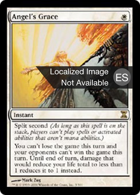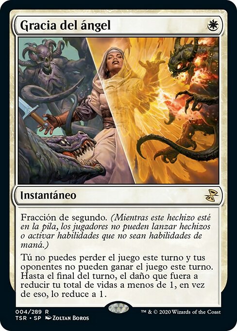 ![]() Variations— Parts— | Gracia del ángelFracción de segundo. (Mientras este hechizo esté en la pila, los jugadores no pueden lanzar hechizos o activar habilidades que no sean habilidades de maná.) Tú no puedes perder el juego este turno y tus oponentes no pueden ganar el juego este turno. Hasta el final del turno, el daño que fuera a reducir tu total de vidas a menos de 1, en vez de eso, lo reduce a 1.