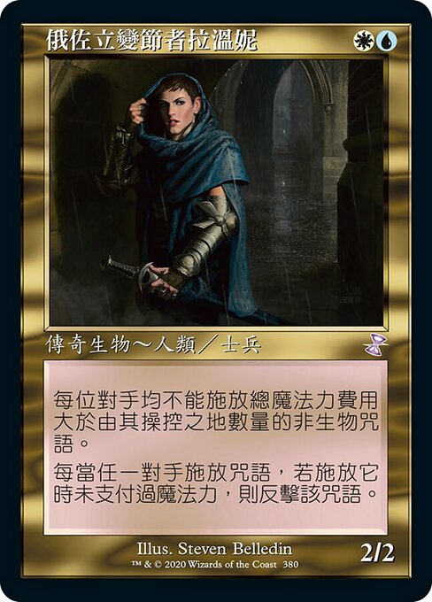 |  Variations— Parts— | Lavinia, renégate d'Azorius2 / 2 Chaque adversaire ne peut pas lancer de sorts non-créature avec un coût converti de mana supérieur au nombre de terrains que ce joueur contrôle. À chaque fois qu'un adversaire lance un sort, si aucun mana n'a été dépensé pour le lancer, contrecarrez ce sort.