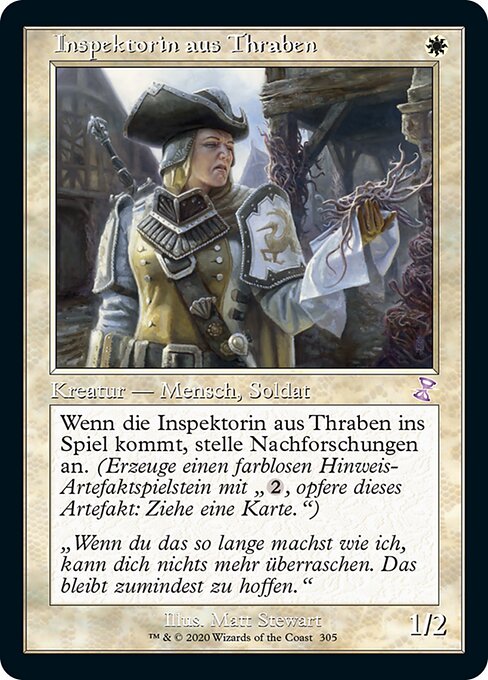 |  Variations— Parts— | Ispettrice di Thraben1 / 2 Quando l'Ispettrice di Thraben entra nel campo di battaglia, indaga. (Crea una pedina artefatto Indizio incolore con "