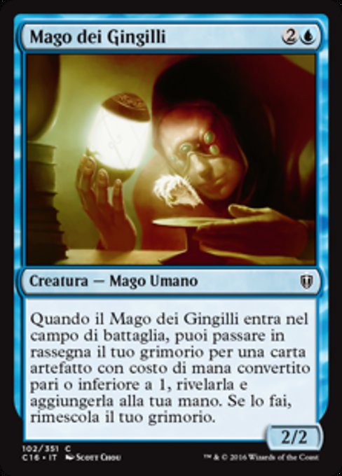 |  Variations— Parts— | Mago dei Gingilli2 / 2 Quando il Mago dei Gingilli entra nel campo di battaglia, puoi passare in rassegna il tuo grimorio per una carta artefatto con costo di mana convertito pari o inferiore a 1, rivelare quella carta, aggiungerla alla tua mano, poi rimescolare il tuo grimorio.