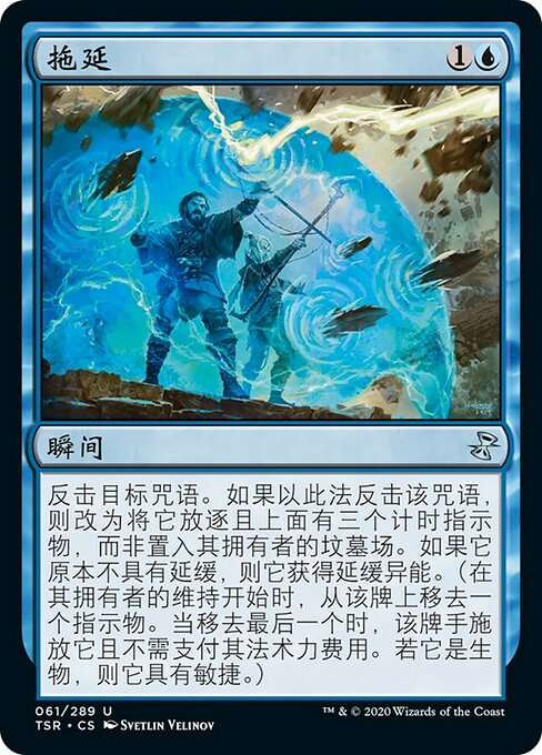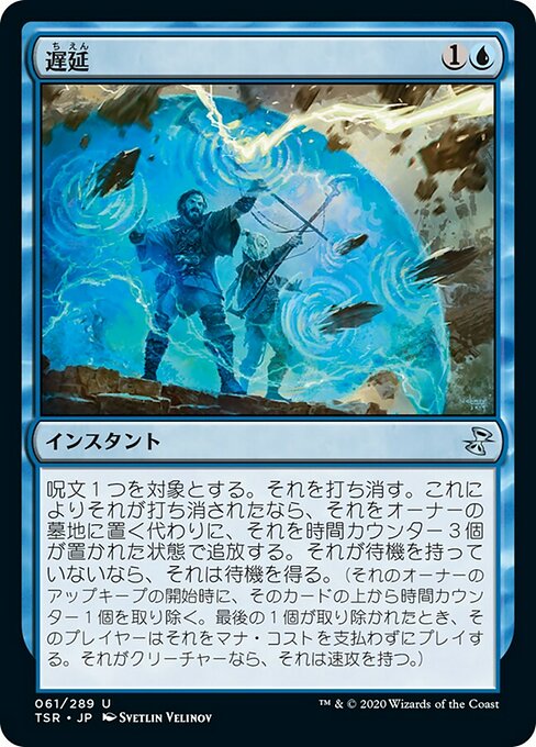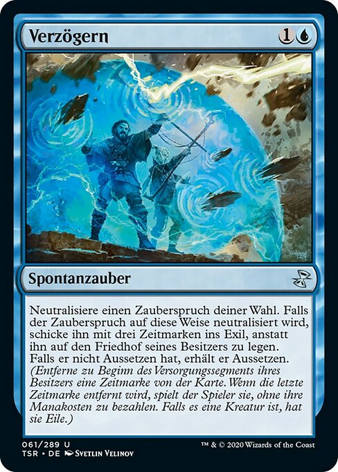 |  Variations— Parts— | RitardoNeutralizza una magia bersaglio. Se la magia è neutralizzata in questo modo, esiliala con tre segnalini tempo su di essa invece di metterla nel cimitero del suo proprietario. Se non ha sospendere, guadagna sospendere. (All'inizio del mantenimento del suo proprietario, rimuovi un segnalino tempo da quella carta. Quando l'ultimo viene rimosso, il giocatore lancia la carta senza pagare il suo costo di mana. Se è una creatura, ha rapidità.)