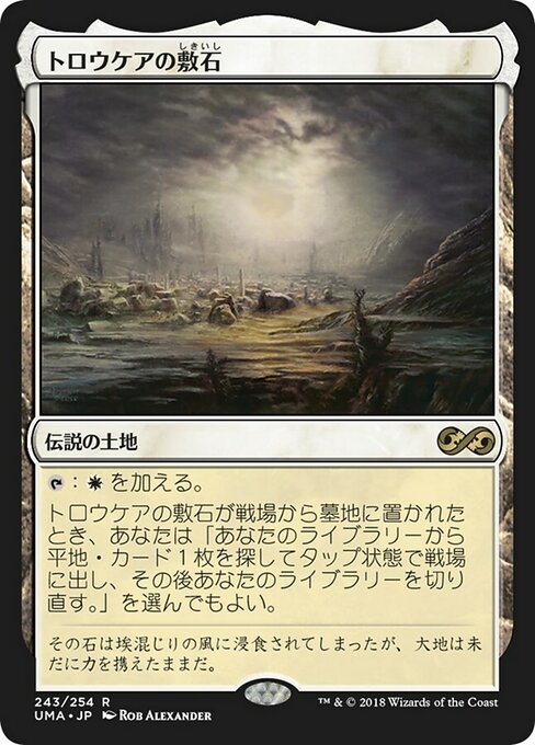|  Variations— Parts— | トロウケアの敷石トロウケアの敷石が戦場から墓地に置かれたとき、あなたは「あなたのライブラリーから平地・カード1枚を探し、タップ状態で戦場に出す。その後、あなたのライブラリーを切り直す。」を選んでもよい。