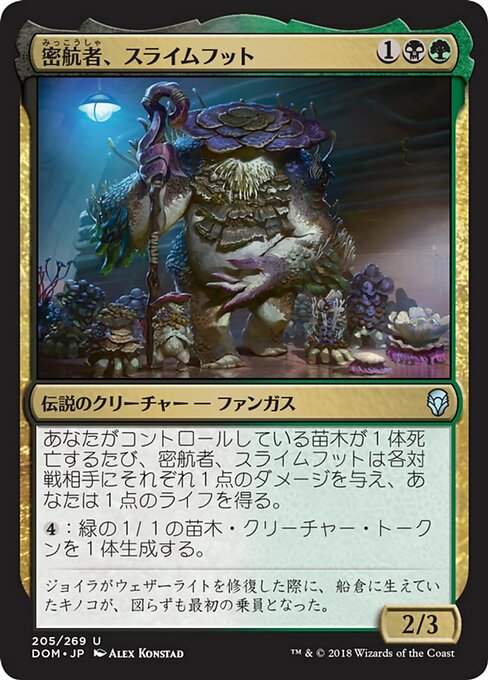 |  Variations— Parts— | 密航者、スライムフット2 / 3 あなたがコントロールしている苗木1体が死亡するたび、密航者、スライムフットは各対戦相手にそれぞれ1点のダメージを与え、あなたは1点のライフを得る。