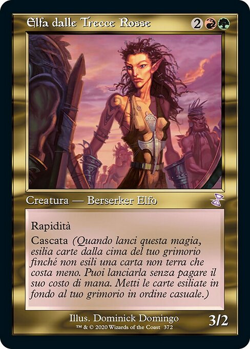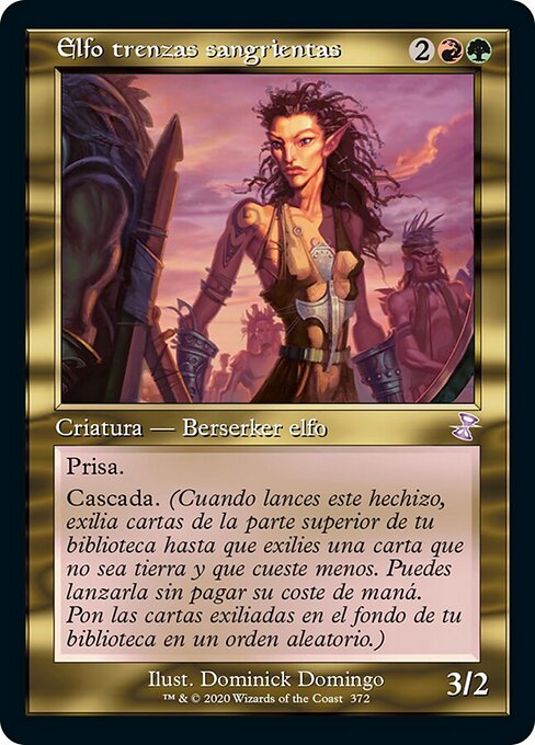 ![]() Variations— Parts— | Elfa Tranças-de-sangue3 / 2 Ímpeto Cascata (Quando conjurar esta mágica, exile os cards do topo do seu grimório até exilar um que não seja terreno e que tenha custo inferior. Você pode conjurá-lo sem pagar seu custo de mana. Coloque os cards exilados no fundo de seu grimório em ordem aleatória.)