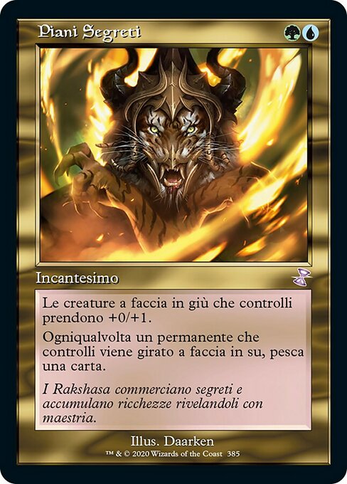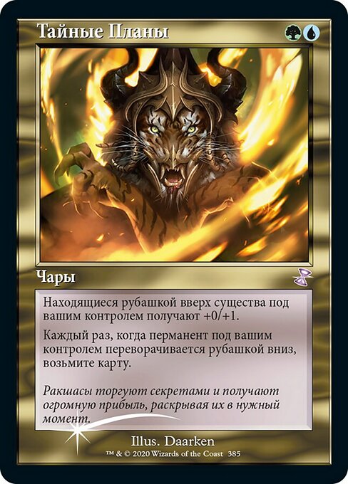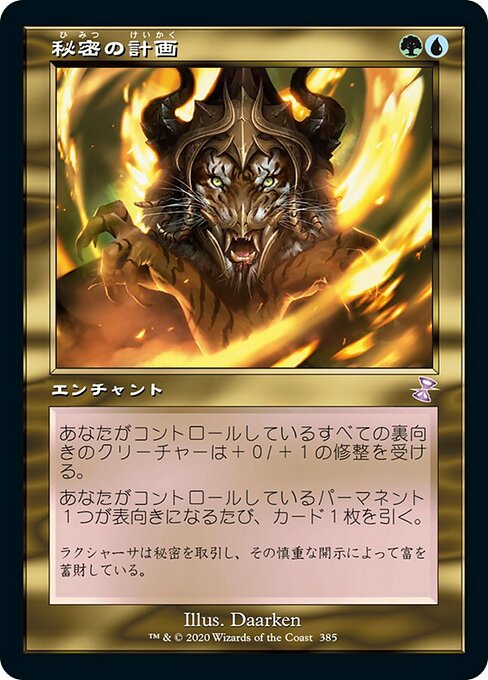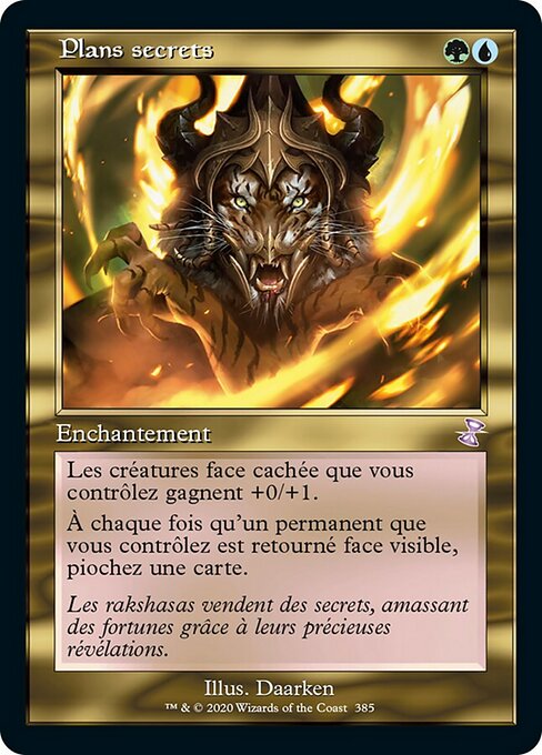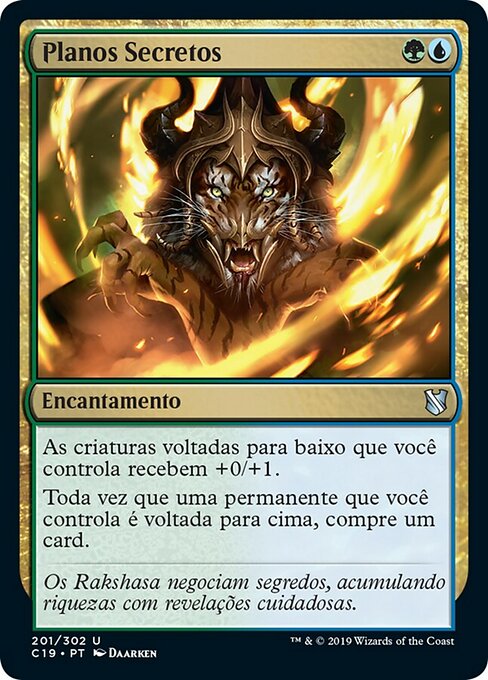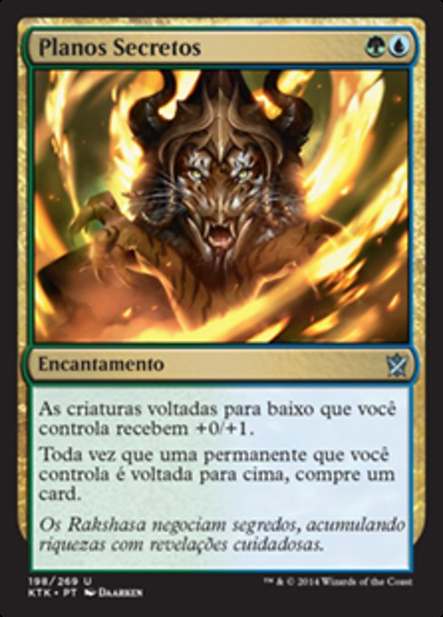 ![]() Variations— Parts— | Planos SecretosAs criaturas voltadas para baixo que você controla recebem +0/+1. Toda vez que uma permanente que você controla é voltada para cima, compre um card.