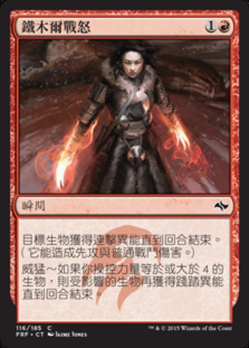 |  Variations— Parts— | 鐵木爾戰怒目標生物獲得連擊異能直到回合結束。 威猛~如果你操控力量等於或大於4的生物,則受影響的生物再獲得踐踏異能直到回合結束。