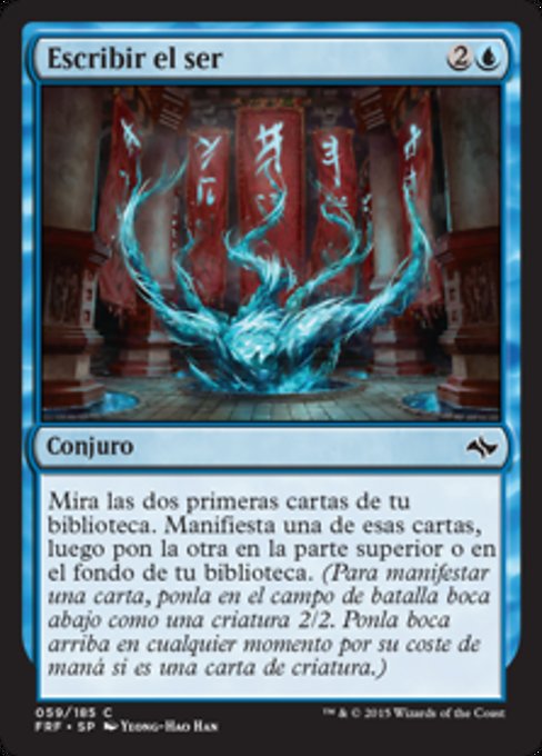 |  Variations— Parts— | Escribir el serMira las dos primeras cartas de tu biblioteca. Manifiesta una de esas cartas, luego pon la otra en la parte superior o en el fondo de tu biblioteca. (Para manifestar una carta, ponla en el campo de batalla boca abajo como una criatura 2/2. Ponla boca arriba en cualquier momento por su coste de maná si es una carta de criatura.)