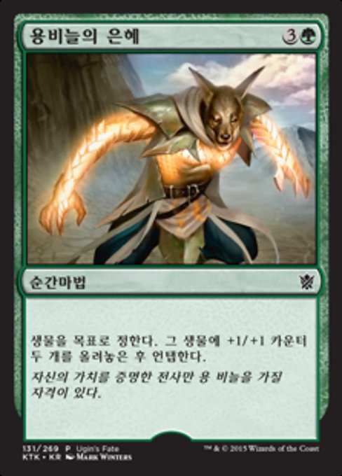 |  Variations— Parts— | 용비늘의 은혜생물을 목표로 정한다. 그 생물에 +1/+1 카운터 두 개를 올려놓은 후 언탭한다.