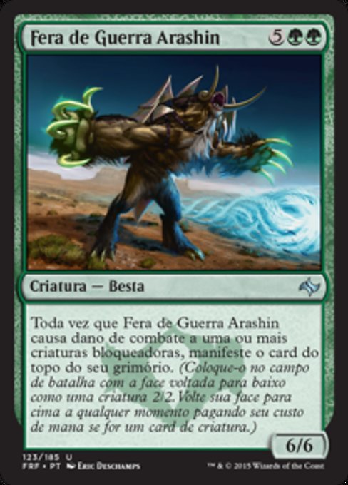 ![]() Variations— Parts— | Fera de Guerra Arashin6 / 6 Toda vez que Fera de Guerra Arashin causa dano de combate a uma ou mais criaturas bloqueadoras, manifeste o card do topo do seu grimório. (Coloque-o no campo de batalha com a face voltada para baixo como uma criatura 2/2. Volte sua face para cima a qualquer momento pagando seu custo de mana se for um card de criatura.)