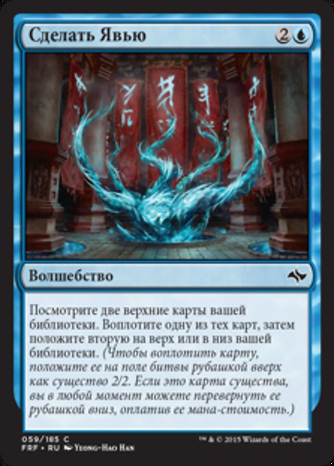 |  Variations— Parts— | Сделать ЯвьюПосмотрите две верхние карты вашей библиотеки. Воплотите одну из тех карт, затем положите вторую на верх или в низ вашей библиотеки. (Чтобы воплотить карту, положите ее на поле битвы рубашкой вверх как существо 2/2. Если это карта существа, вы в любой момент можете перевернуть ее рубашкой вниз, оплатив ее мана-стоимость.)