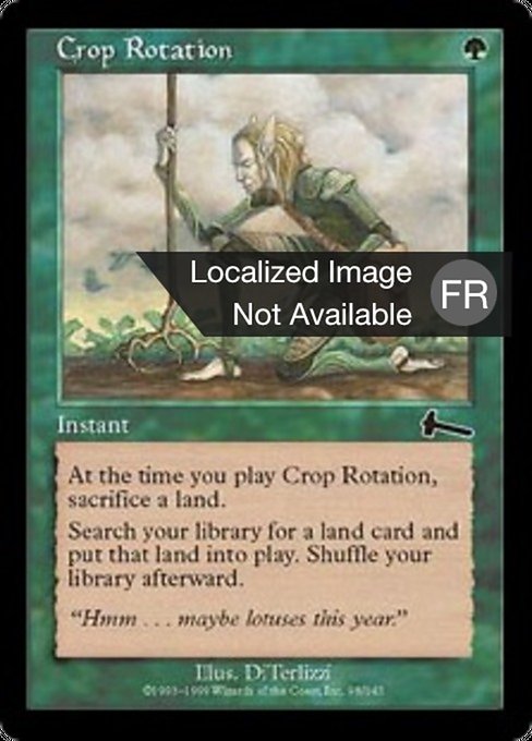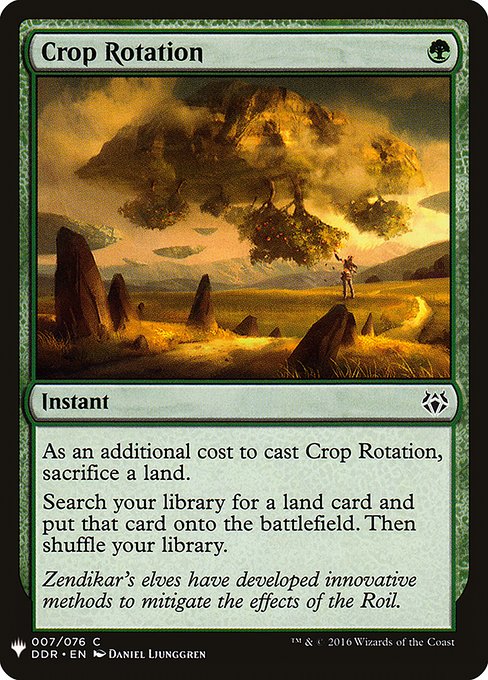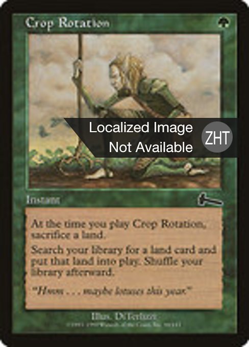 |  Variations— Parts— | Crop RotationAs an additional cost to cast this spell, sacrifice a land. Search your library for a land card, put that card onto the battlefield, then shuffle.