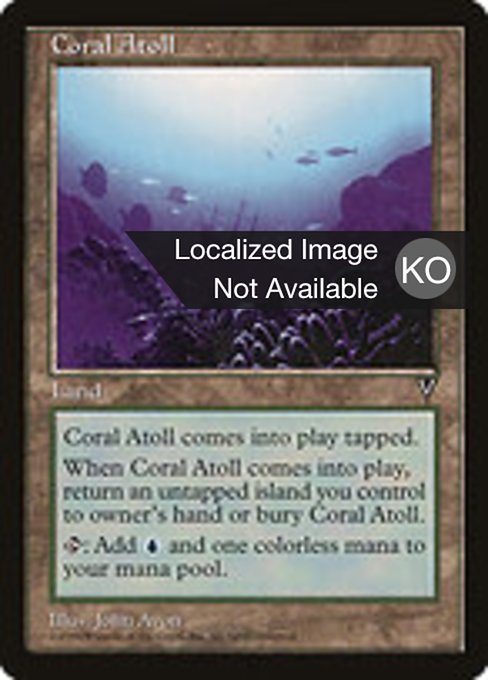 ![]() Variations— Parts— | Coral AtollThis land enters tapped. When this land enters, sacrifice it unless you return an untapped Island you control to its owner's hand.