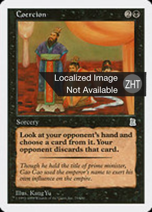 |  Variations— Parts— | CoercionTarget opponent reveals their hand. You choose a card from it. That player discards that card.