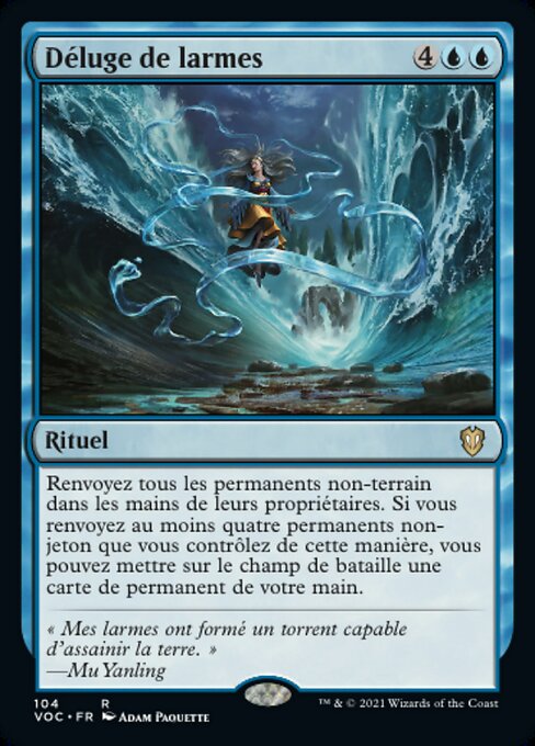 ![]() Variations— Parts— | Flood of TearsReturn all nonland permanents to their owners' hands. If you return four or more nontoken permanents you control this way, you may put a permanent card from your hand onto the battlefield.
