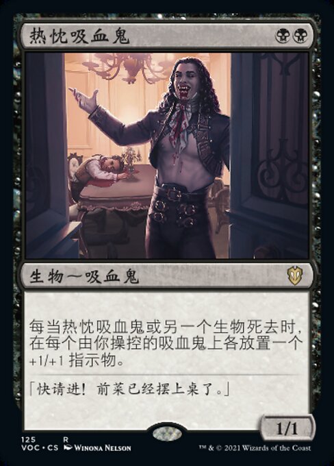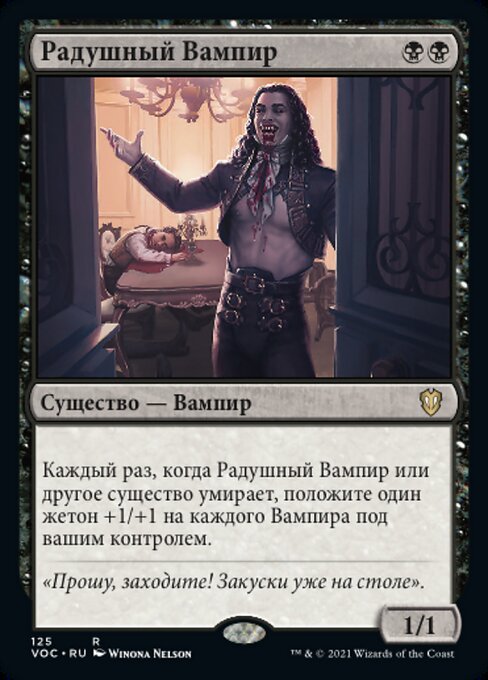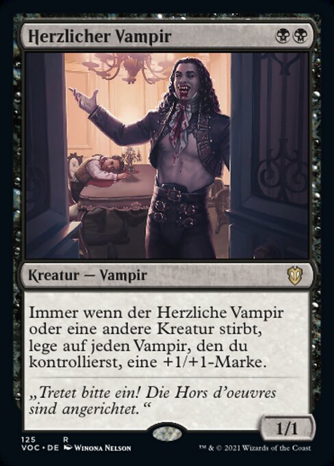 ![]() Variations— Parts— | Cordial Vampire1 / 1 Whenever this creature or another creature dies, put a +1/+1 counter on each Vampire you control.