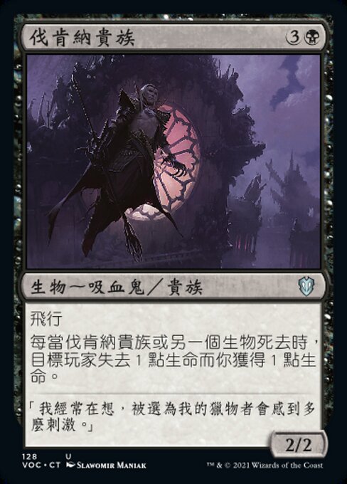 |  Variations— Parts— | Falkenrath Noble2 / 2 Flying Whenever this creature or another creature dies, target player loses 1 life and you gain 1 life.