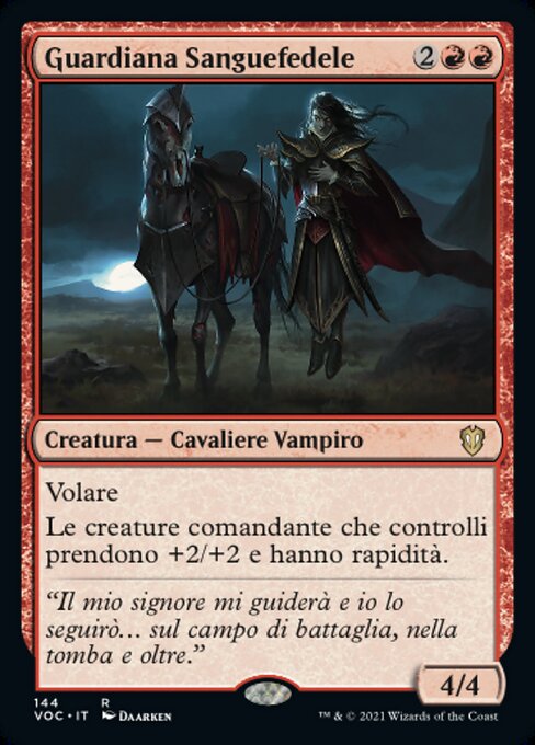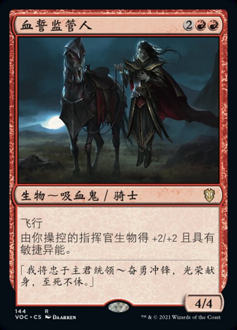 ![]() Variations— Parts—  | Bloodsworn Steward4 / 4 Flying Commander creatures you control get +2/+2 and have haste.