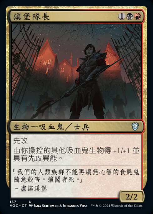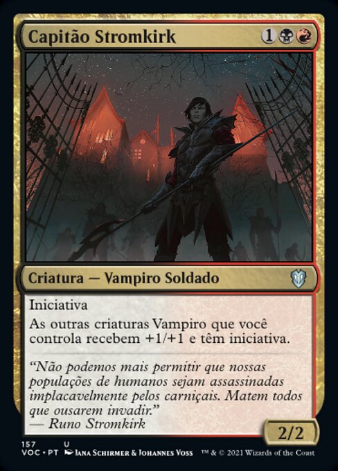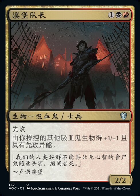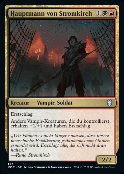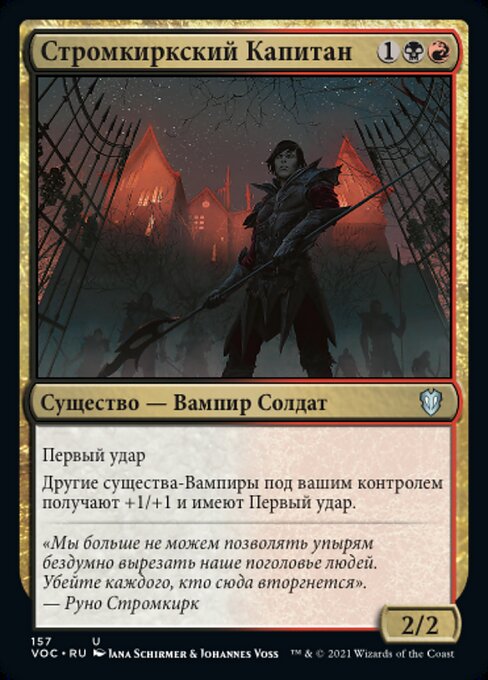 ![]() Variations— Parts— | Stromkirk Captain2 / 2 First strike Other Vampire creatures you control get +1/+1 and have first strike.