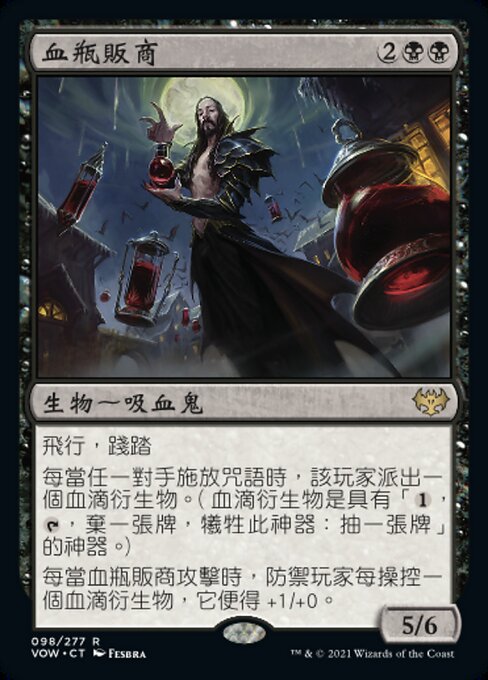 ![]() Variations : 1Parts : 2 | Bloodvial Purveyor5 / 6 Flying, trample Whenever an opponent casts a spell, that player creates a Blood token. (It's an artifact with " Whenever this creature attacks, it gets +1/+0 until end of turn for each Blood token defending player controls.