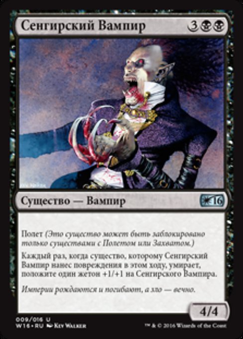 |  Variations— Parts— | センギアの吸血鬼4 / 4 飛行(このクリーチャーは飛行や到達を持たないクリーチャーによってはブロックされない。) このターンにセンギアの吸血鬼によってダメージを与えられたクリーチャーが1体死亡するたび、センギアの吸血鬼の上に+1/+1カウンターを1個置く。
