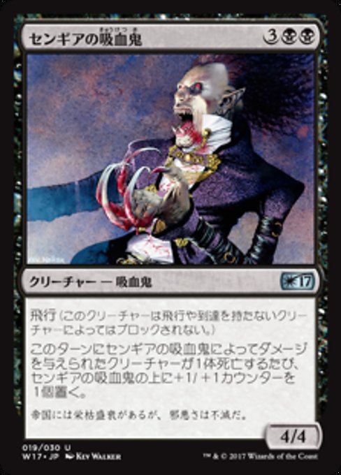 ![]() Variations— Parts— | Sengir Vampire4 / 4 Flying (This creature can't be blocked except by creatures with flying or reach.) Whenever a creature dealt damage by this creature this turn dies, put a +1/+1 counter on this creature.