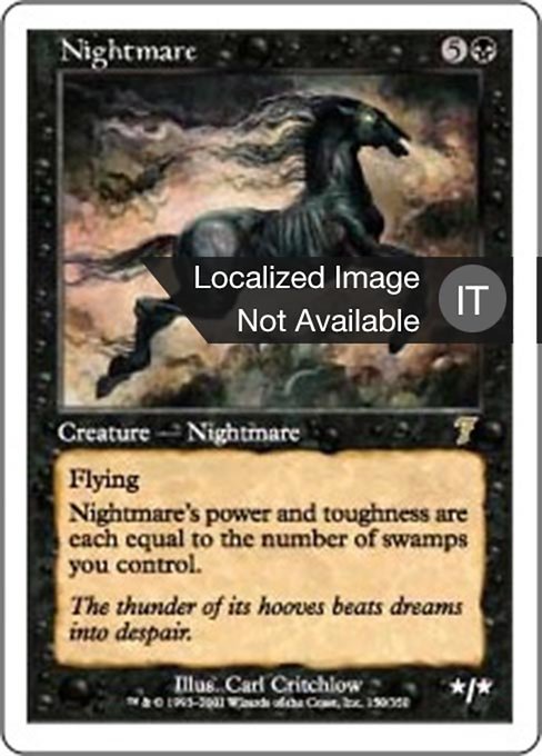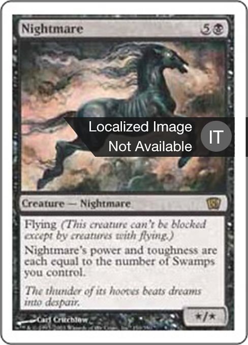 |  Variations— Parts— | Incubo* / * Volare (Questa creatura non può essere bloccata tranne che da creature con volare o raggiungere.) La forza e la costituzione dell'Incubo sono pari al numero di Paludi che controlli.