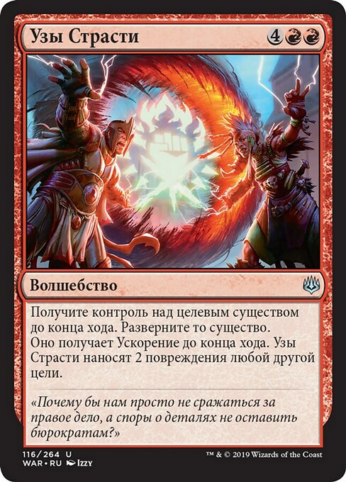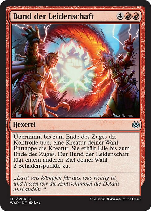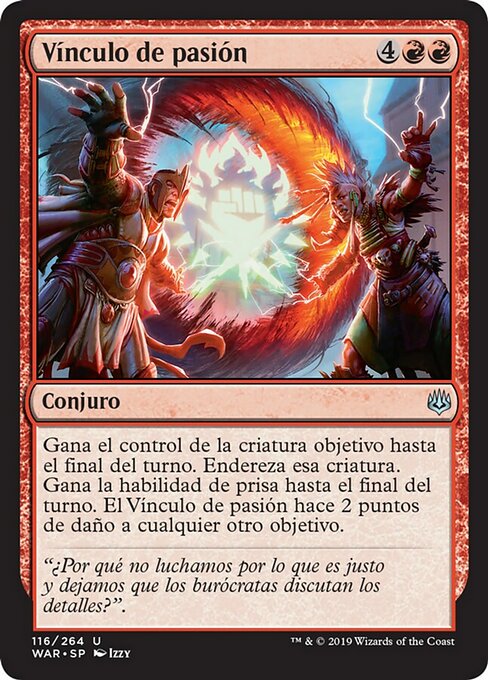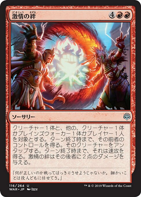 ![]() Variations— Parts— | Bond of PassionGain control of target creature until end of turn. Untap that creature. It gains haste until end of turn. Bond of Passion deals 2 damage to any other target.
