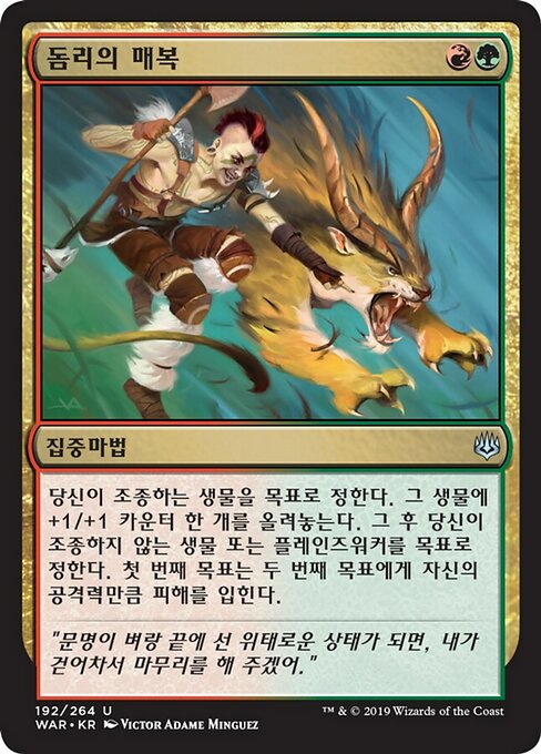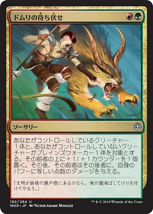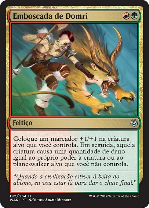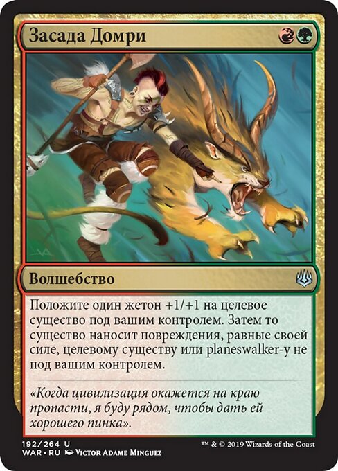 ![]() Variations— Parts— | Domri's AmbushPut a +1/+1 counter on target creature you control. Then that creature deals damage equal to its power to target creature or planeswalker you don't control.