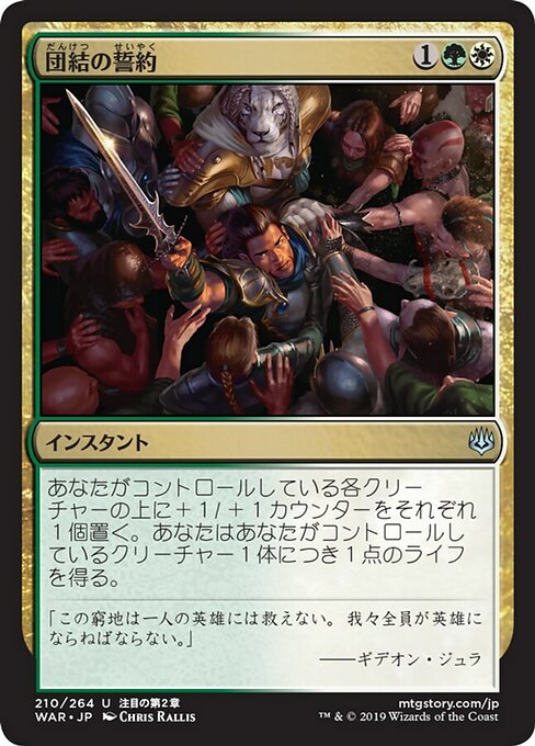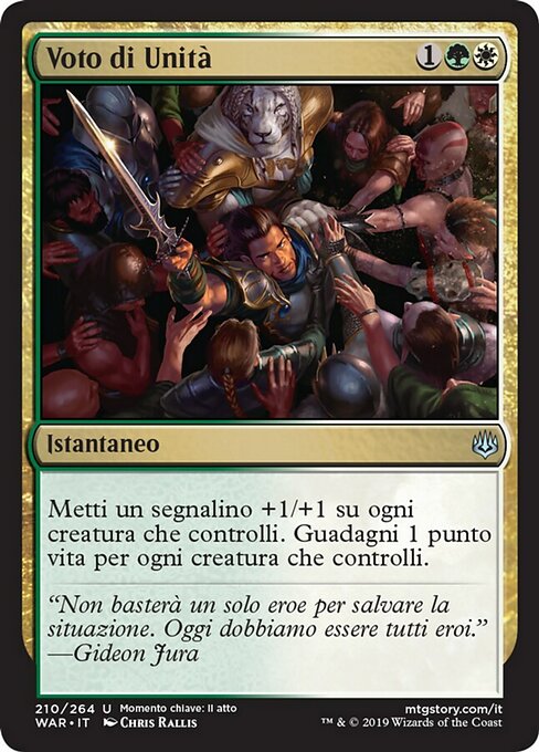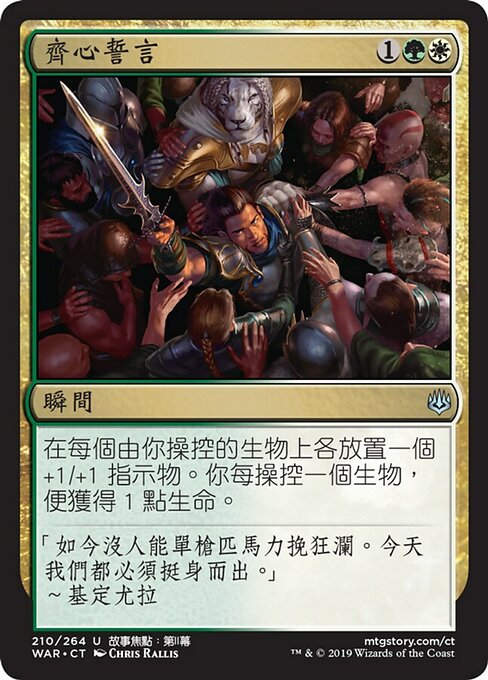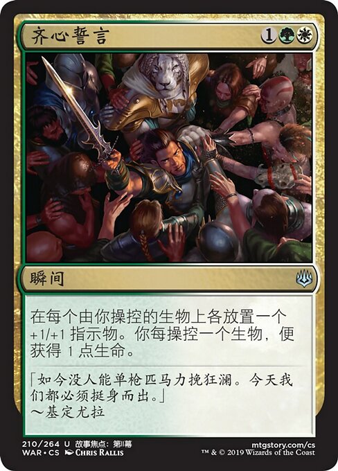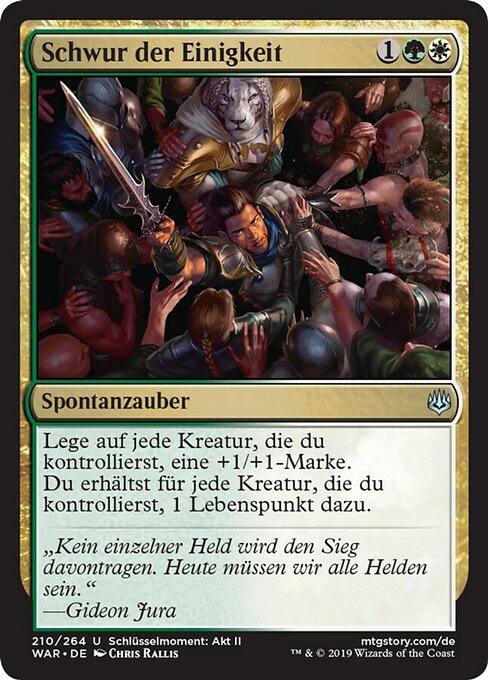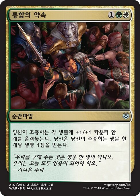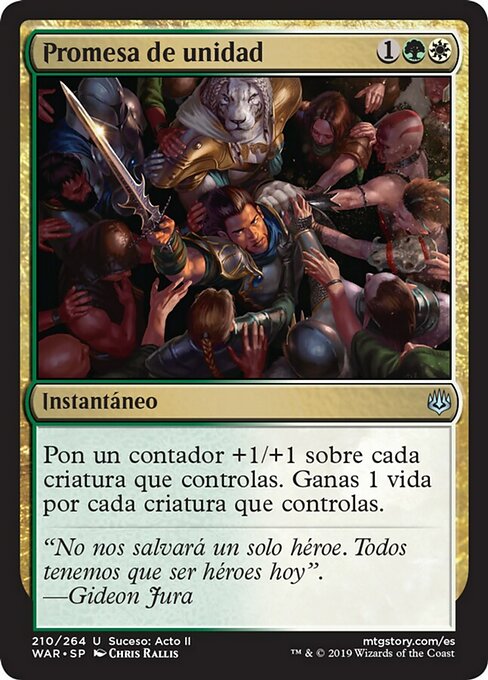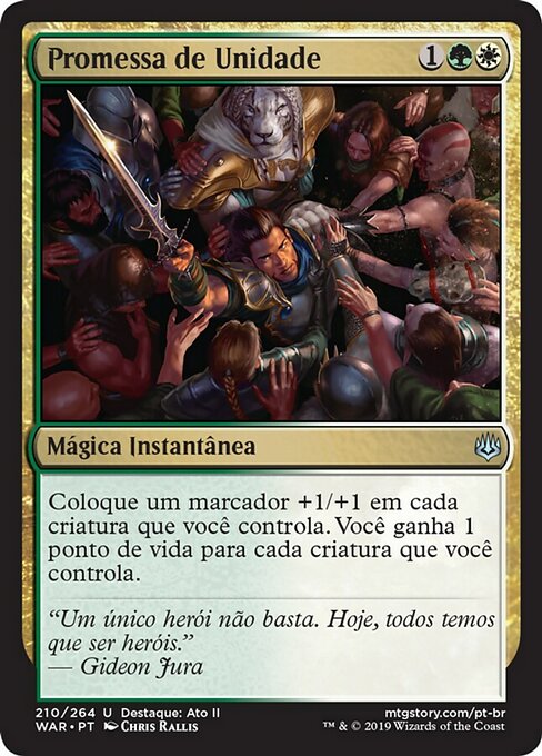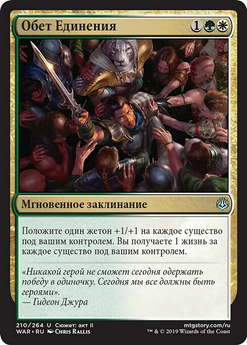 ![]() Variations— Parts— | Pledge of UnityPut a +1/+1 counter on each creature you control. You gain 1 life for each creature you control.