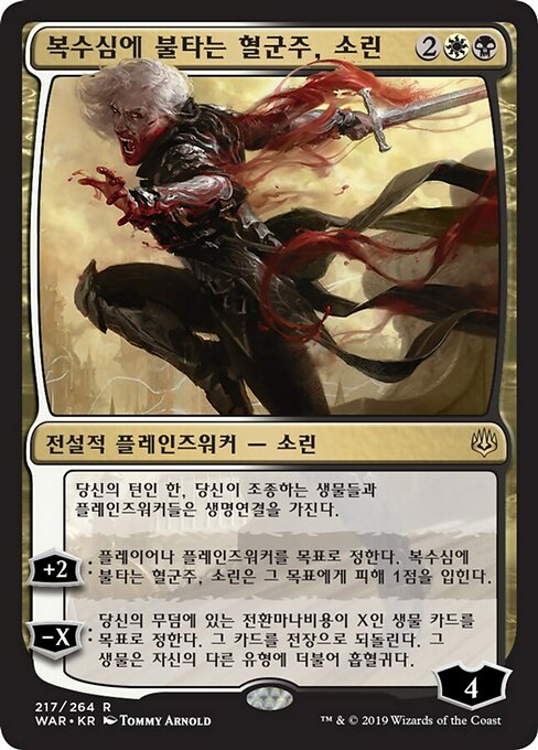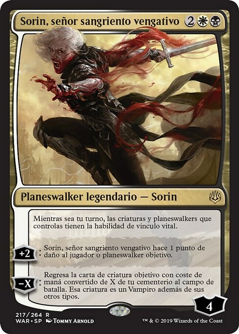 ![]() Variations— Parts— | Sorin, Vengeful BloodlordDuring your turn, creatures and planeswalkers you control have lifelink. +2 : Sorin deals 1 damage to target player or planeswalker. −X : Return target creature card with mana value X from your graveyard to the battlefield. That creature is a Vampire in addition to its other types.