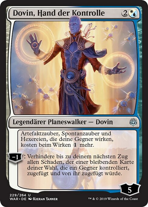 ![]() Variations— Parts— | Dovin, Hand of ControlArtifact, instant, and sorcery spells your opponents cast cost −1 : Until your next turn, prevent all damage that would be dealt to and dealt by target permanent an opponent controls.
