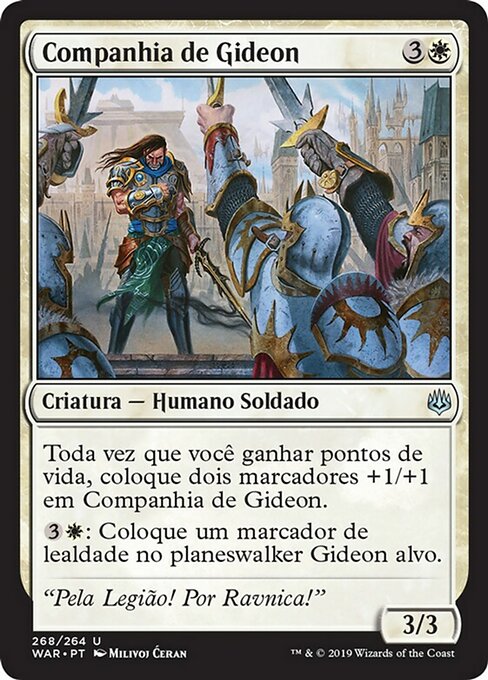 ![]() Variations— Parts— | Gideon's Company3 / 3 Whenever you gain life, put two +1/+1 counters on this creature.