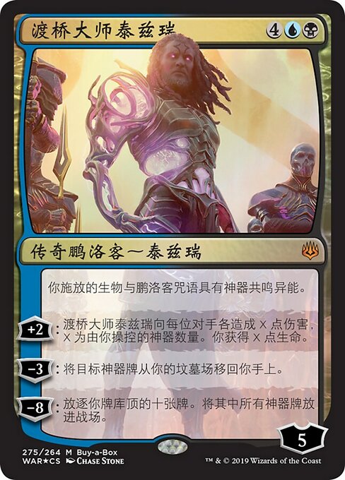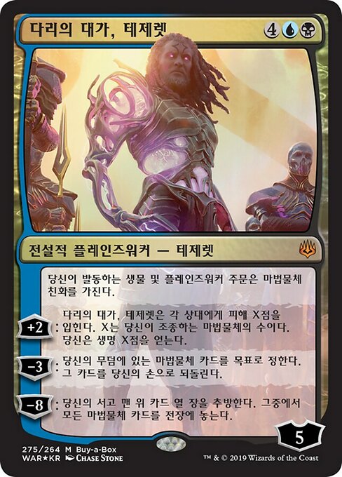 ![]() Variations— Parts— | Tezzeret, Master of the BridgeCreature and planeswalker spells you cast have affinity for artifacts. (They cost +2 : Tezzeret deals X damage to each opponent, where X is the number of artifacts you control. You gain X life. −3 : Return target artifact card from your graveyard to your hand. −8 : Exile the top ten cards of your library. Put all artifact cards from among them onto the battlefield.