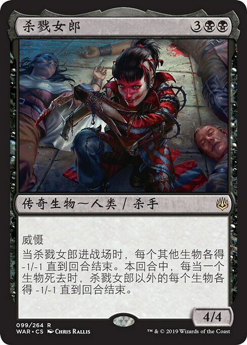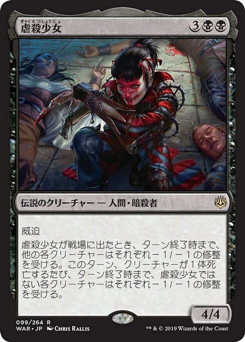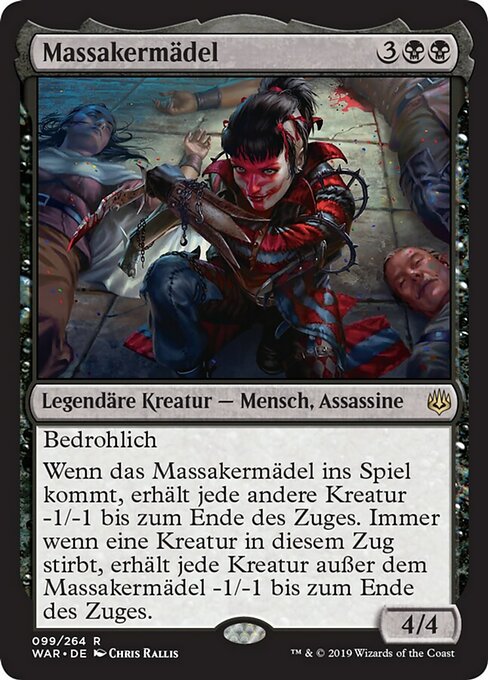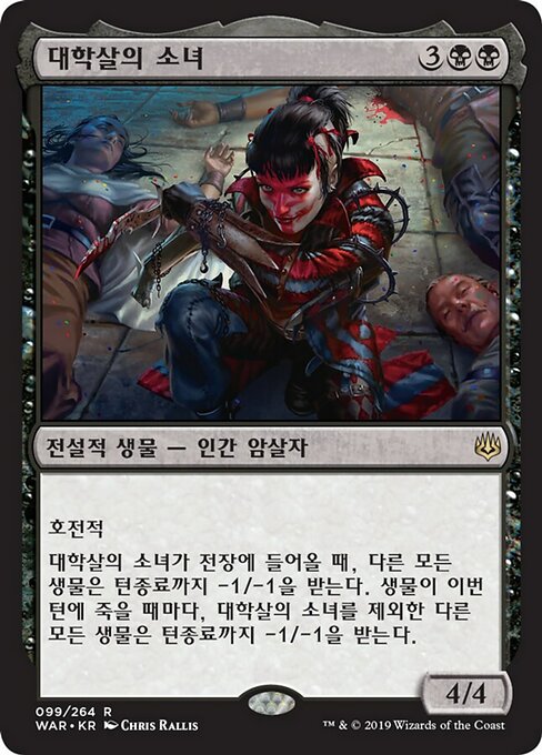 ![]() Variations— Parts— | Massacre Girl4 / 4 Menace When Massacre Girl enters, each other creature gets -1/-1 until end of turn. Whenever a creature dies this turn, each creature other than Massacre Girl gets -1/-1 until end of turn.
