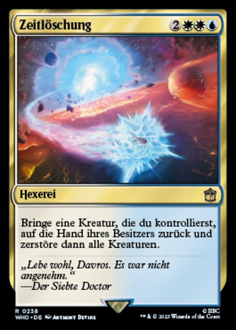 ![]() Variations : 3Parts— | Time WipeReturn a creature you control to its owner's hand, then destroy all creatures.