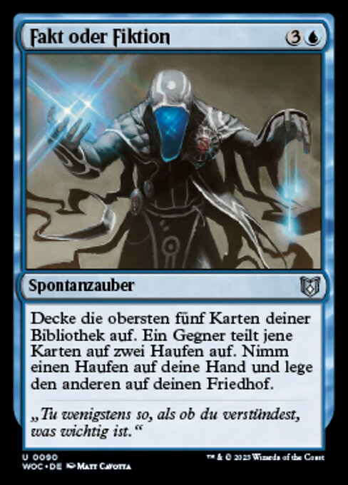 |  Variations— Parts— | Fact or FictionReveal the top five cards of your library. An opponent separates those cards into two piles. Put one pile into your hand and the other into your graveyard.