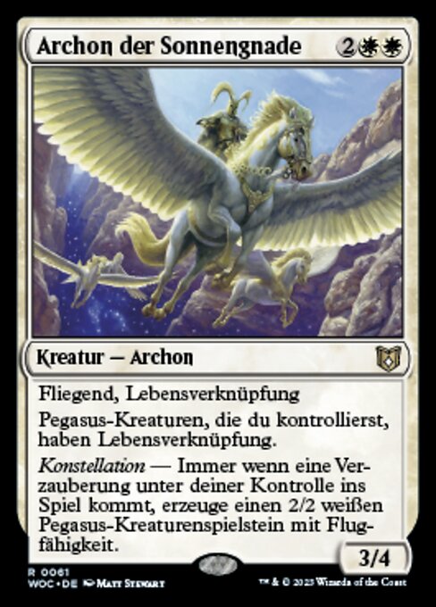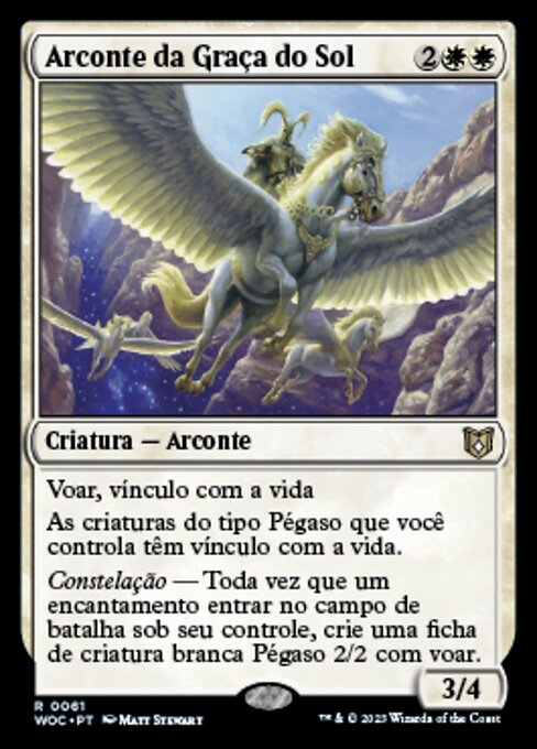 |  Variations— Parts— | Arconte della Grazia Solare3 / 4 Volare, legame vitale Le creature Pegaso che controlli hanno legame vitale. Costellazione — Ogniqualvolta un incantesimo entra nel campo di battaglia sotto il tuo controllo, crea una pedina creatura Pegaso 2/2 bianca con volare.