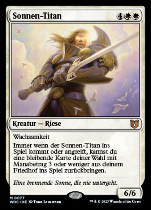|  Variations— Parts— | Titano Solare6 / 6 Cautela Ogniqualvolta il Titano Solare entra nel campo di battaglia o attacca, puoi rimettere sul campo di battaglia una carta permanente bersaglio con valore di mana pari o inferiore a 3 dal tuo cimitero.