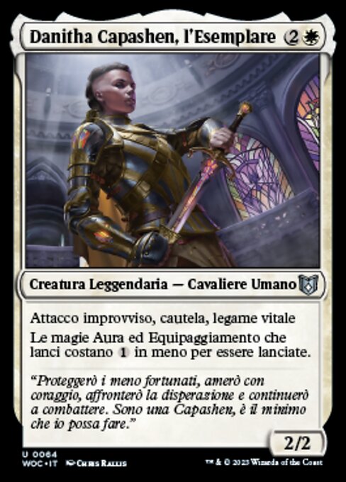 ![]() Variations— Parts— | 模範となる者、ダニサ・キャパシェン2 / 2 先制攻撃、警戒、絆魂 あなたがオーラや装備品である呪文を唱えるためのコストは