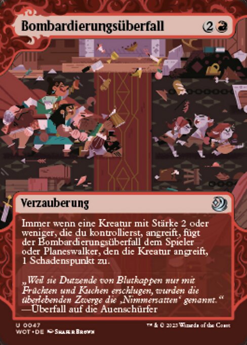 ![]() Variations— Parts— | Bombardeo de incursiónSiempre que una criatura que controlas con fuerza de 2 o menos ataque, el Bombardeo de incursión hace 1 punto de daño al jugador o planeswalker al que esa criatura esté atacando.