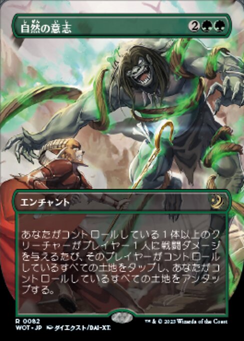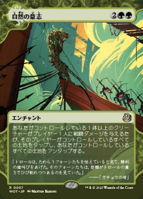 ![]() Variations : 1Parts— | 自然の意志あなたがコントロールしている1体以上のクリーチャーがプレイヤー1人に戦闘ダメージを与えるたび、そのプレイヤーがコントロールしているすべての土地をタップし、あなたがコントロールしているすべての土地をアンタップする。