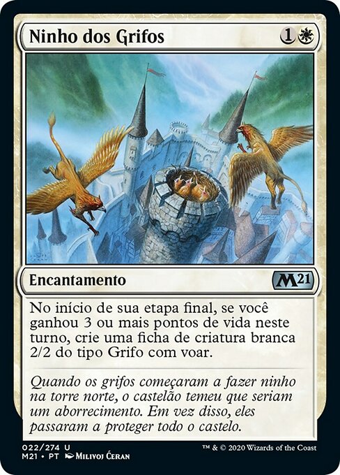 ![]() Variations— Parts— | Ninho dos GrifosNo início de sua etapa final, se você ganhou 3 ou mais pontos de vida neste turno, crie uma ficha de criatura branca 2/2 do tipo Grifo com voar.