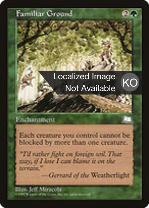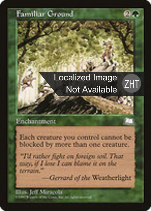 |  Variations— Parts— | Familiar GroundEach creature you control can't be blocked by more than one creature.