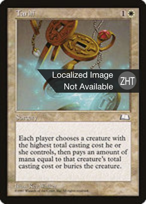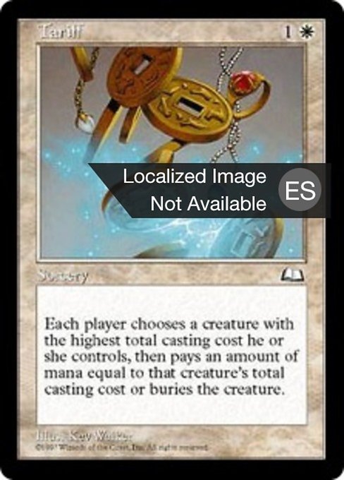 ![]() Variations— Parts— | TariffaEach player sacrifices the creature they control with the greatest mana value unless they pay that creature's mana cost. If two or more creatures a player controls are tied for greatest, that player chooses one.