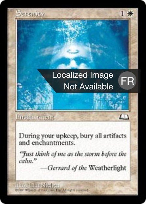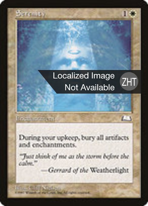 ![]() Variations— Parts— | SerenityAt the beginning of your upkeep, destroy all artifacts and enchantments. They can't be regenerated.
