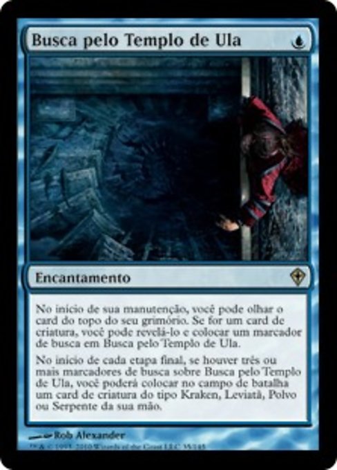 ![]() Variations— Parts— | Quest for Ula's TempleAt the beginning of your upkeep, you may look at the top card of your library. If it's a creature card, you may reveal it and put a quest counter on this enchantment. At the beginning of each end step, if there are three or more quest counters on this enchantment, you may put a Kraken, Leviathan, Octopus, or Serpent creature card from your hand onto the battlefield.